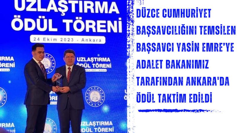 Cumhuriyet Başsavcılığında dosyası olan tarafların anlaşmazlık ve uyuşmazlık yollarının çözümü için bir araya getirilmesinde ve anlaşmazlıklarının çözülmesinde başarılı olan Düzce Cumhuriyet Başsavcılığını temsilen Başsavcı Yasin Emre’ye Adalet Bakanı Yılmaz Tunç tarafından Ankara'da ödül taktim edildi.