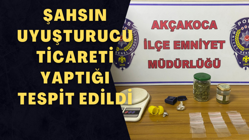 Akçakoca İlçe Emniyet Müdürlüğü Ekiplerince yapılan çalışmalar sonucunda T.T. isimli şahsın uyuşturucu ticareti yaptığı tespit edildi. Şahsa yapılan operasyon neticesinde 2 kavanoz halinde toplam 536,7 gram esrar maddesi, 1 adet hassas terazi, 40 adet küçük şeffaf poşet, 2.4 gram esrar tohumu ele geçirildi. Gözaltına alınan şahıs çıkarıldığı mahkemece Adli Kontrol Şartıyla serbest bırakıldı. DMHA