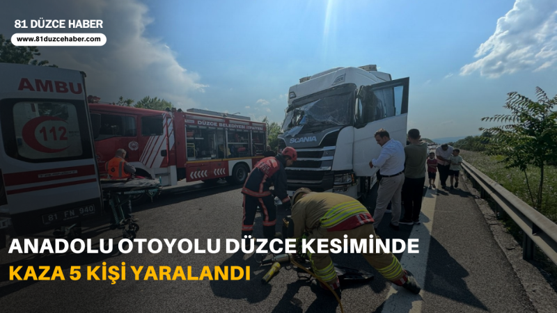 DMHA -DÜZCE- Anadolu Otoyolu Küçükmelen mevkisinde istanbul istikametine seyir halinde olan E.Y. idaresindeki 55 ANY 148 plakalı Tır ile R.K. yönetimideki 01 CNJ 70 plakalı tır çarpıştı.Çarpışmanın etkisiyle 55 ANY 148 plakalı tır sürüsü E.Y., E.Y, H.Y, H.Y ve Y.Y yaralandı.Diğer sürücülerin ihbarı üzerine olay yerine polis, itfaiye ve sağlık ekipleri sevkedildi.Yaralananlara kaza yerinde yapılan ilk müdahalenin ardından Düzce Üniversitesi Araştırma ve uygulama Hastanesi'ne kaldırıldı.Polis ekipleri kazayla ilgili soruşturma başlatıldığını bildirdi.