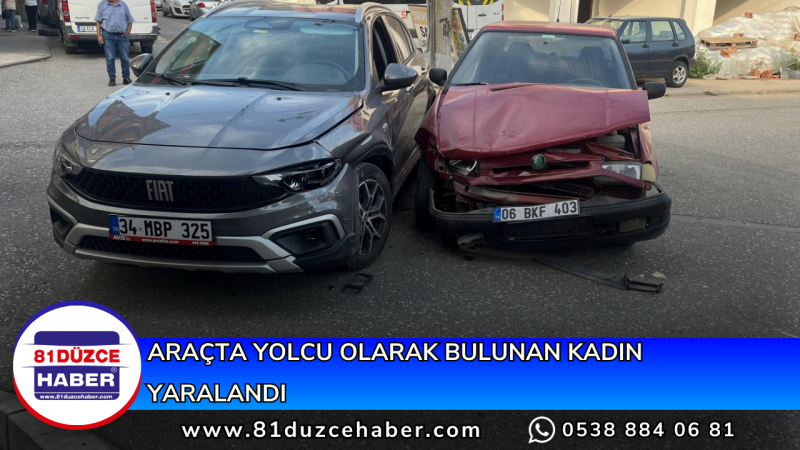 DMHA DÜZCE - Kaza Nusrettin Mahallesi İstiklal Caddesi üzerinde meydana geldi. Edinilen bilgiye göre İ.M idaresindeki 34 MBP 325 plakalı araç sürücüsü Y.Y. kontrolünde 06 BKF 403 plakalı araç ile çarpıştı. Yaşanan kazada araçta yolcu olarak bulunan B.H. yaralandı. Kazayı görenlerin ihbarı üzerine olay yerine sağlık ve polis ekipleri sevk edildi. Sağlık ekiplerinin ilk müdahalesi sonrasında hastaneye kaldırılan yaralının durumunun iyi olduğu öğrenildi. Polis ekipleri kaza ile ilgili soruşturma başlattı.