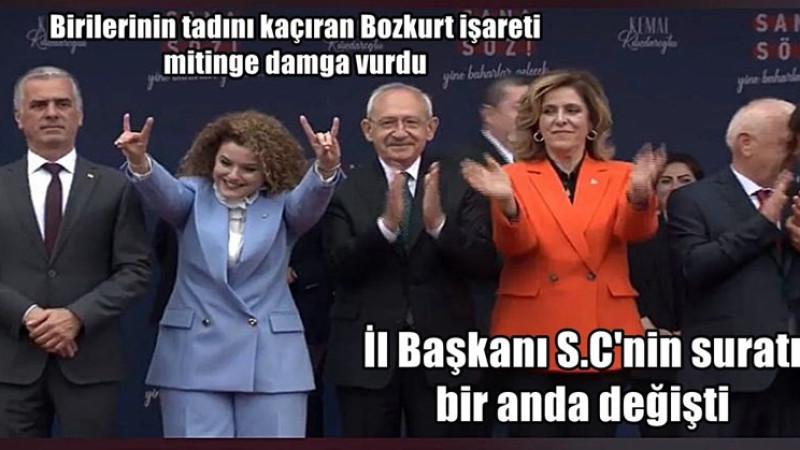 İYİ Partili Aslıhan Akbal Tüysüz, CHP Genel Başkanı ve Millet ittifakı Cumhurbaşkanı Adayı Kemal Kılıçdaroğlu ile İBB Belediye Başkanı Ekrem İmamoğlu’nun ardından davet üzerine sahneye çıktı. Düzceliler tanıtılan Tüysüz, Bozkurt işareti yapınca sahne bir anda buz kesti. Özellikle CHP İl Başkanı S.C’nin tüm tadı kaçarken, yüz ifadesi ise kameralara yansıdı. Tüysüz ise kendisinden emin bir şekilde uzun süre bozkurt işareti ile halkı selamlamaya devam etti.