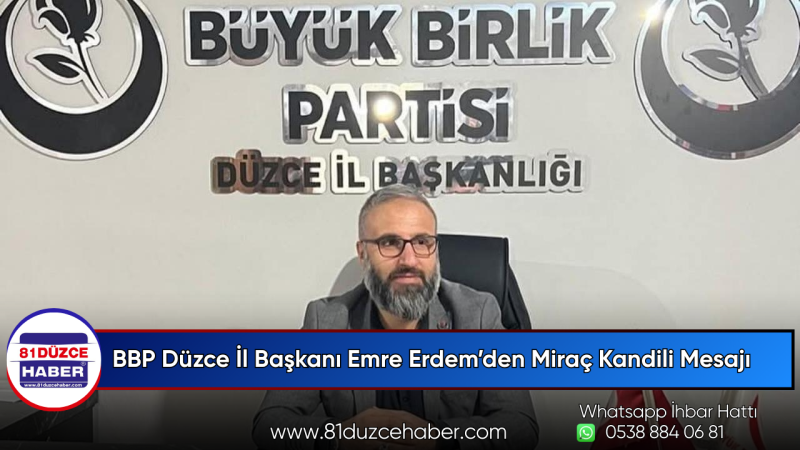 Büyük Birlik Partisi (BBP) Düzce İl Başkanı Emre Erdem, Miraç Kandili dolayısıyla yayımladığı mesajda, bu mübarek gecenin manevi anlamına ve toplumsal hayattaki önemine dikkat çekti.