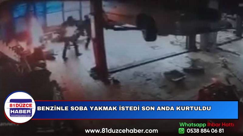 DMHA DÜZCE-Olay Eski Sanayi Çarşısında bulunan bir oto tamir dükkanında meydana geldi. Sobayı alevlendirmek için elindeki benzini dökmek isteyen E.T isimli kişi sobanın parlaması sonucunda yaralanmaktan son anda kurtuldu. Üzerine sıçrayan alevler çevredeki vatandaşlar tarafından söndürülürken olay anı iş yerimin güvenlik kamerasına yansıdı .