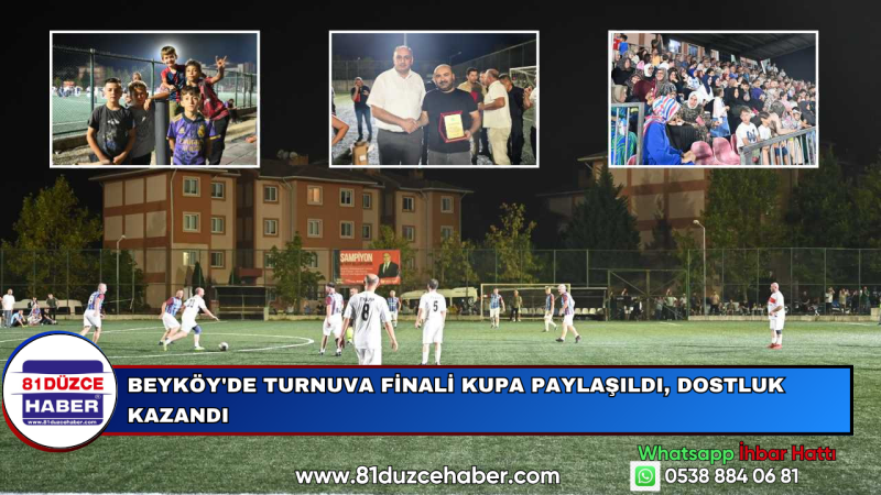 DMHA DÜZCE-Heyecan dolu karşılaşma 1-1’lik eşitlikle tamamlandı. Uzatma dakikalarına gidilmeden, Beyköy Belediye Başkanı Fatih Ocak’ın kararıyla her iki takım da turnuva birincisi ilan edildi. Başkan Ocak, turnuvanın temel amacının kupa kazanmaktan öte, mahalleler arasında dostluk, centilmenlik ve dayanışma ruhunu pekiştirmek olduğunu vurguladı.