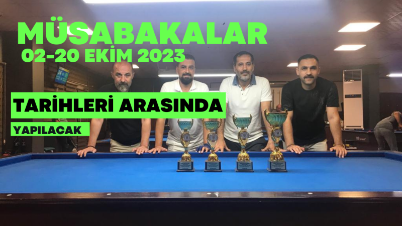 Türkiye Bilardo Federasyonunun düzenlediği 3 Bant Erkekler 2. Etap Türkiye Şampiyonası müsabakaları 02-20 Ekim 2023 tarihleri arasında Türkiye Bilardo Federasyonu Bilardo Tesisi Gölbaşı/Ankara’da yapılacak. Düzce’den 16 sporcu ilimizi şampiyonada temsil edecek. Türkiye Şampiyonası öncesi Zirve Bilardo Spor Salonu’nda düzenlenen 3 Bant Bilardo Turnuvasına 36 sporcu katıldı. Yapılan müsabakaların ardından Baha Alptekin birinci, Cumali Kurt ikinci, Özkan Kocabıyık ve İbrahim Ardıç üçüncü oldu.