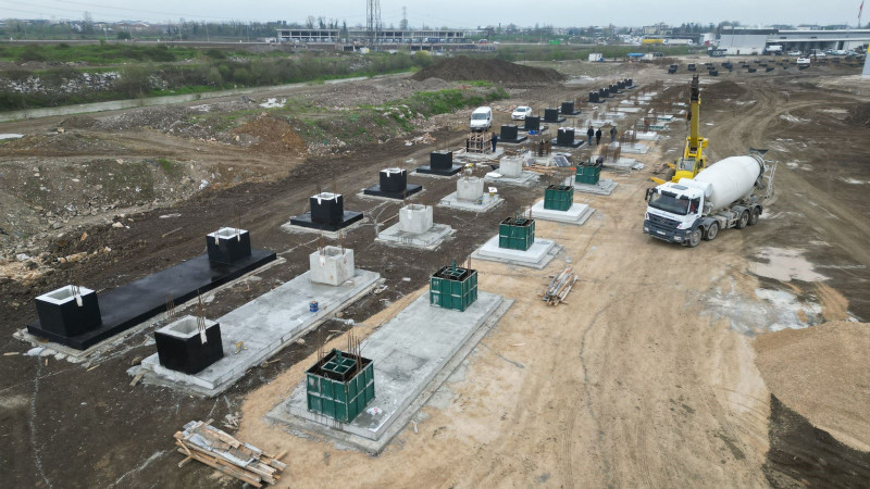 Temel soketlerinin imalatı ve yerleştirme işlemlerinin sürdüğü alanda aynı süreçte toprak ve zemin iyileştirme çalışmaları da sürdürülüyor.