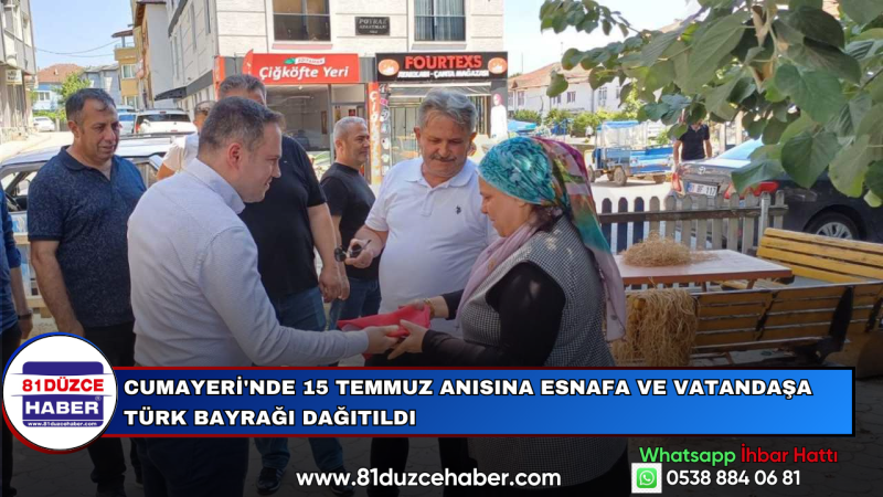 Cumayeri’nde 15 Temmuz Demokrasi ve Millî Birlik Günü anma etkinlikleri kapsamında anlamlı bir çalışma gerçekleştirildi. Kaymakam Taha Furkan Sönmezel, ilçe protokol üyeleri ve siyasi parti temsilcileri, esnaf ve vatandaşlara şanlı Türk bayrağı dağıttı.