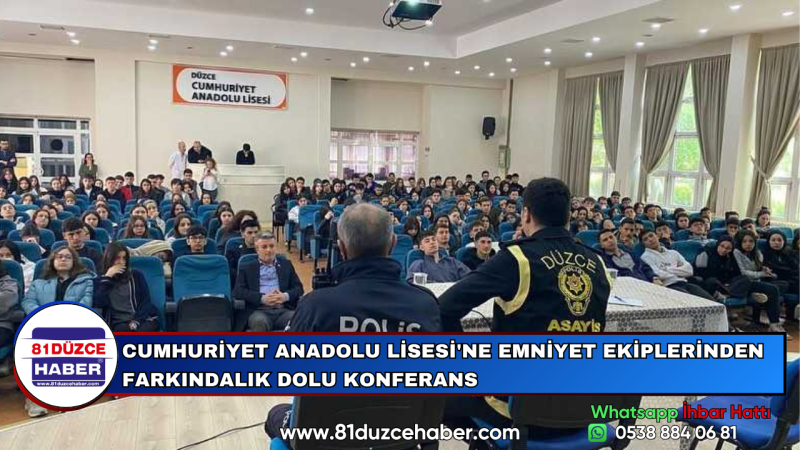 Düzce İl Emniyet Müdürlüğü, Düzce İl Millî Eğitim Müdürlüğü ve Cumhuriyet Anadolu Lisesi iş birliğiyle öğrencilerle asayiş ve güvenlik konularında farkındalık oluşturmak amacıyla önemli bir etkinlik düzenlendi.