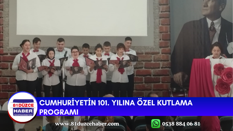 DMHA DÜZCE - Özel Eğitim Meslek Okulu öğrencileri ve öğretmenleri tarafından 29 Ekim Cumhuriyet Bayramı 101. yılına özel kutlama programı düzenlendi. Düzce İl Milli Eğitim Müdürü Emrullah Aydın’ın da katıldığı programda öğrenciler tarafından hazırlanan günün anlam ve önemine yönelik gösteriler, müzik dinletileri ve konuşmalar yer aldı. Yapılan programda Türk Bayrakları gururla dalgalandırıldı.