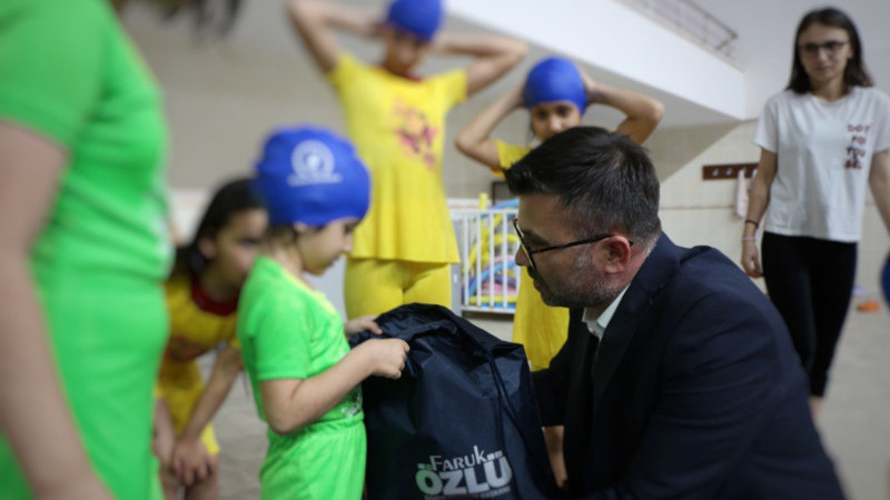 Depremzede çocukların ilk yüzme eğitimini Gençlik ve Spor Müdürü İsa Yazıcı yakından takip etti. Çocuklara mayo, havlu, bone ve terlik hediye eden İsa Yazıcı, çocuklarla yakından ilgilendi.