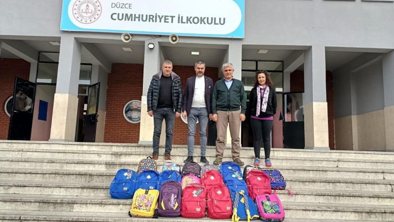 Düzce Ticaret ve Sanayi Odası yönetimi, deprem felaketinin ardından aileleriyle birlikte Düzce'ye gelen öğrencilere içinde kırtasiye malzemelerinin bulunduğu çanta hediye etti.