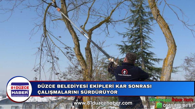 Düzce’yi etkisi altına alan yoğun kar yağışı sonrasında Düzce belediyesi ekipleri çalışmalarına aralıksız devam ediyor. Ekipler karın ağırlığı nedeniyle kırılan ve zarar gören ağaç dallarının tehlikelerini ortadan kaldırıyor.