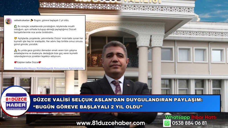 Düzce Valisi Selçuk Aslan’dan Duygulandıran Paylaşım: “Bugün Göreve Başlayalı 2 Yıl Oldu”