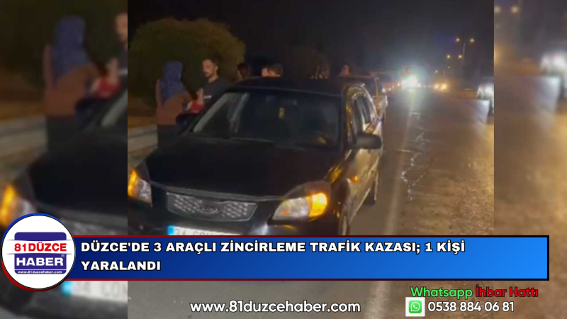 DMHA DÜZCE-Edinilen bilgilere göre, Y.U. yönetimindeki 34 CON 732 plakalı otomobil ile aynı istikamete giden İ.Y.’nin kullandığı 81 AEP 514 plakalı otomobil çarpıştı. Kazayı fark edemeyen R.E. idaresindeki 81 ER 156 plakalı otomobil ise önceki iki araca çarptı. Çarpışmanın etkisiyle otomobillerde bulunan 1 kişi yaralandı. İhbar üzerine bölgeye sağlık ve polis ekipleri sevkedildi. Yaralıya olay yerinde ilk müdahale yapıldıktan sonra Düzce Atatürk Devlet Hastanesi’ne kaldırıldı. Kazayla ilgili soruşturma başlatıldığı bildirildi.