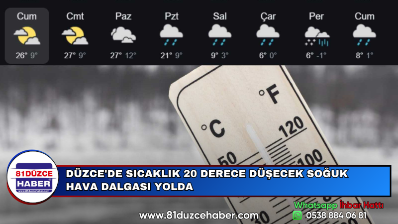 Düzce yeni haftaya 20 derece birden düşecek olan hava sıcaklıkları ile başlıyacak. Meteoroloji verilerine göre Karadeniz'den gelecek soğuk hava dalgası ile büyük bir sıcaklık düşüşü beklendiği belirtildi.