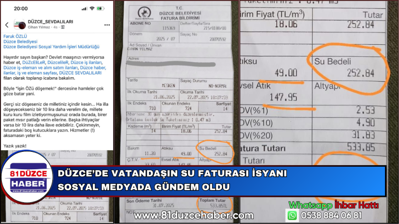 Düzce’de yaşayan Cihan Yılmaz isimli bir vatandaşın, sosyal medya hesabı üzerinden yaptığı su faturası paylaşımı kamuoyunda dikkat çekti. Yılmaz, paylaşımında Düzce Belediyesi’ne ve Belediye Başkanı Faruk Özlü’ye sert sözlerle tepki gösterdi.