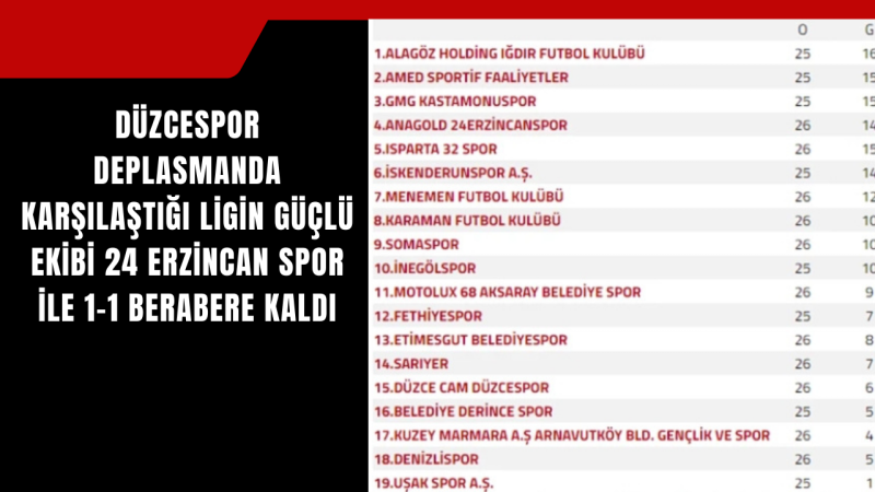 TFF 2 Lig kırmızı grup'ta 27 hafta mücadelesinde Düzcespor deplasmanda karşılaştığı ligin güçlü ekibi 24 Erzincan Spor ile 1-1 berabere kaldı.