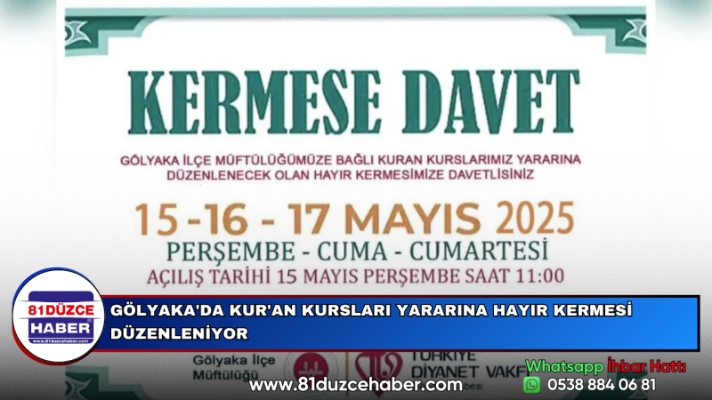 DMHA DÜZCE-İlçe Müftülüğüne bağlı Kur’an kursları yararına yapılacak kermes, 15-16-17 Mayıs 2025 tarihlerinde gerçekleştirilecek. Açılış ise 15 Mayıs Perşembe günü saat 11.00’de Gölyaka Merkez Camii bahçesinde yapılacak.Kermesin amacı, Kur’an kurslarının ihtiyaçlarının karşılanması ve hayırseverlerin desteğini artırmak olarak belirtildi. Türkiye Diyanet Vakfı Gölyaka Şubesi’nin katkılarıyla düzenlenen etkinliğe tüm vatandaşlar davet edildi.Gölyaka halkının yoğun katılım göstermesi beklenen kermes, hem dayanışmayı güçlendirecek hem de eğitim faaliyetlerine destek sağlayacak.