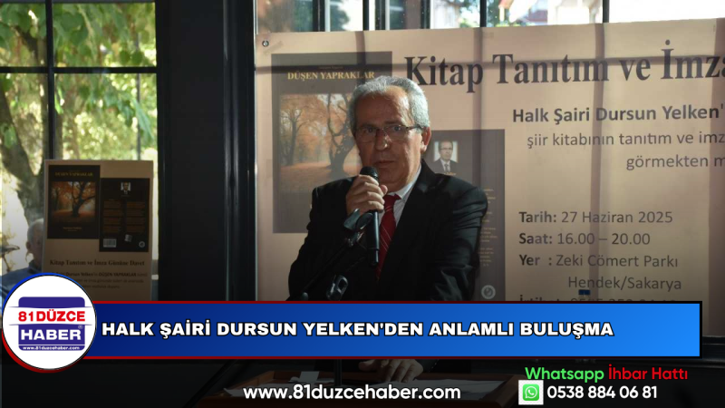 Sakarya’nın Hendek ilçesinde edebiyat ve kültürseverlerin buluştuğu anlamlı bir etkinliğe ev sahipliği yapıldı. Halk Şairi Dursun Yelken’in “Düşen Yapraklar” adlı yeni şiir kitabının tanıtım ve imza günü gerçekleştirildi.