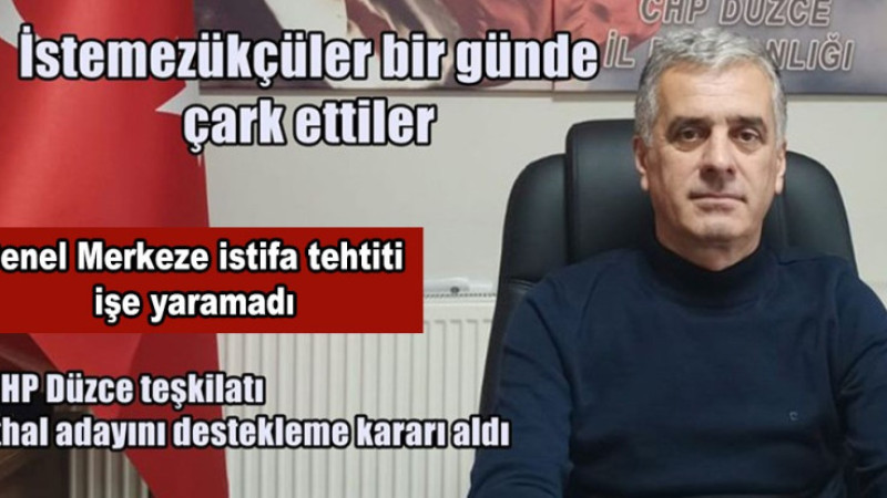 CHP Düzce il teşkilatı CHP Genel Başkanı Kemal Kılıçdaroğlu’nun tek adam kararı sonrası Düzce Milletvekili Adayı yaptığı Talih Özcan’ı istemezken bir günde çark ederek arkasındayız mesajı verdiler.