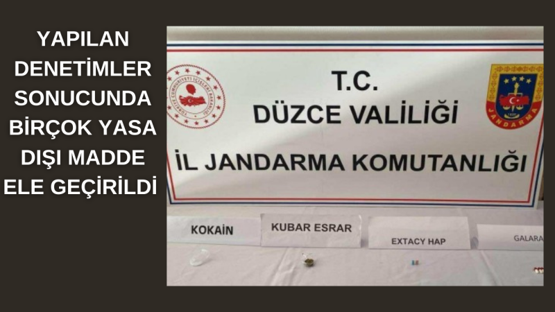 Düzce İl Jandarma Komutanlığı Ekipleri tarafından 9-16 Ekim 2023 tarihleri arasında Düzce'nin eşitliyerlerinde yapılan denetimler sonucunda bir çok yasa dışı malzeme ele geçirildi. Ele geçirilen malzemeler "1 gram Kokain, 30 gram Kubar Esrar,6 gram Metanfetamin,27 gram Bonzai,14 adet Uyuşturucu/ Uyarıcı Hap, 2 Adet Ruhsatsız Tabanca, 1 adet Ruhsatsız Av Tüfeği, 3 adet Bıçak,1 adet Muşta ve 14 Yasa Dışı Göçmen yakalandı. Yapılan Denetimlerde hakkında uyuşturucu madde imal ve ticareti suçundan hakkında işlem yapılan 1 şüpheli tutuklanırken Uyuşturucu madde kullanma ve bulundurma suçunu işleyen 25 şahıs ile 6136 sayılı kanuna muhalefet suçundan 4 şahıs hakkında adli işlem başlatıldı.