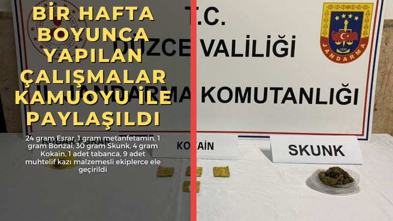 Düzce İl Jandarma Komutanlığı Ekiplerince Düzce'nin çeşitli noktalarında 27 Kasım 3 Aralık tarihleri arasında yürütülen çalışmalar neticesinde 24 gram Esrar, 1 gram metanfetamin, 1 gram Bonzai, 30 gram Skunk, 4 gram Kokain, 1 adet tabanca, 9 adet muhtelif kazı malzemesli ekiplerce ele geçirildi. Uyuşturucu bulundurmak ve kullanmak suçundan 11 kişi , kültür ve tabiat varlıklarına dair suç kapsamında 2 kişi hakkında işlem başlatıldı. Yapılan çalışmalar sonucunda yasadışı ülkeye girdiği tespit edilen 1 göçmen yakalandı. DMHA
