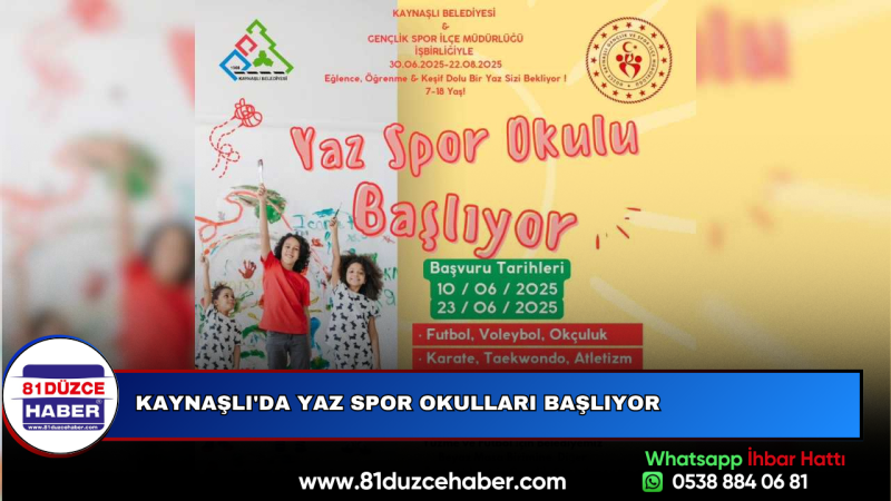 DMHA DÜZCE-Yaz Spor Okulları başvuruları ise 10-23 Haziran 2025 tarihleri arasında kabul edilecek.Yüzme ve futbol branşlarına başvurular Kaynaşlı Belediyesi Beyaz Masa Birimi’ne, diğer branşlar için ise Kaynaşlı Gençlik ve Spor İlçe Müdürlüğü’ne yapılacaktır.