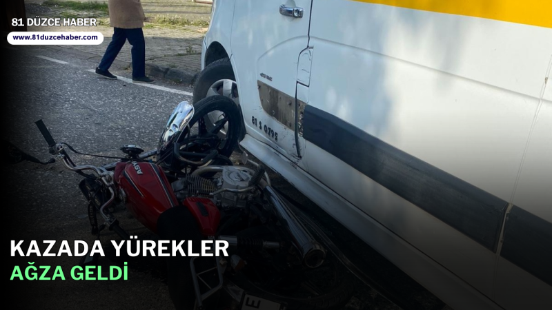 DMHA DÜZCE - Kaza Aziziye Mahllesi Avni Akyol İlkokulu önünde meydana geldi. Edinilen bilgiye göre okul servisi ile motosiklet çarpıştı. Süleyman A.idaresindeki 81 AAE 148 plakalı motosiklet 81 S 0867 plakalı okul servisine çarpışması sonucunda motosiklet sürücüsü Süleyman A. yaralandı. Çevredeki vatandaşların ihbarı üzerine olay yerine sağlık ve polis ekipleri sev edildi. Yaralı motosiklet sürücüsü ilk müdahalenin ardından hastaneye kaldırılırken durumunun iyi olduğu öğrenildi. Yaşanan kaza sonrasında servis sürücüsü ifadesi alınmak üzere polis merkezine götürüldü. Polis ekipleri kaza ile ilgili soruşturma başlattı.