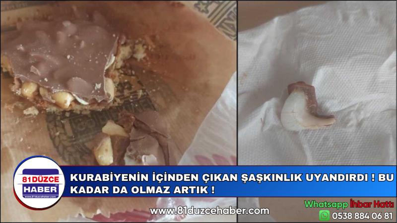 DMHA DÜZCE – Olay Düzce’de bir çok noktada unlu mamuller üzerine hizmet veren ve geçtiğimiz zamanlarda adı başka bir skandala karışan bir firmanın Krempark AVM karşısındaki şubesinde meydana geldi. Edinilen bilgiye göre sabah saatlerinde şubeden kurabiye alan vatandaş kurabiyenin içinden çıkanlar sonrası şok yaşadı. Ürünü yediği esnada sert bir nesne ile karşılaştı. Kurabiyenin içini açıp baktığında ise gözlerine inanamadı. Kurabiye içerisinde bulunan sert cismin deniz kabuğu olduğunu gören vatandaş durumu işletme yetkililerine iletti. Bu tür bir ihmalin daha kötü bir şekilde sonuçlanmaması en büyük teselli oldu.