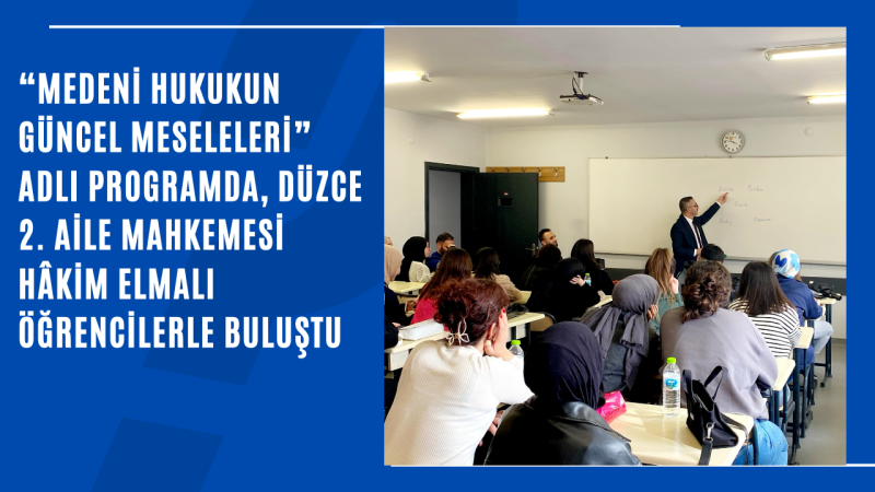 Düzce Üniversitesi Sosyal Bilimler Meslek Yüksekokulu tarafından düzenlenen “Medeni Hukukun Güncel Meseleleri” adlı programda, Düzce 2. Aile Mahkemesi Hâkimi Aşkı Elmalı öğrencilerle buluştu