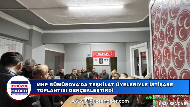 DMHA DÜZCE - Milliyetçi Hareket Partisi Düzce İl Başkanı İlhami Caboğlu, İl Başkan Yardımcısı Halil Uzun, İl Yönetimi ve Gümüşova İlçe Başkanı Engin Usta’nın başkanlığında Gümüşova’da geniş katılımlı bir istişare toplantısı düzenlendi. MHP teşkilat üyelerinin yoğun ilgi gösterdiği toplantıda, Gümüşova ve Düzce genelindeki güncel sorunlar, yerel yönetimler, teşkilat çalışmaları ele alındı. İl ve ilçe yönetimi, parti üyelerinin talep ve önerilerini dinleyerek, çözüm odaklı bir yaklaşım sergiledi.