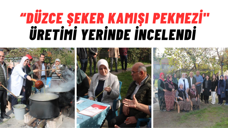 Çilimli ilçesi Tepe köyünde 10 da alanda şeker kamışı üretimi yapan çiftçi Ahmet Kutlu'nun pekmez üretim aşamasını inceleyerek konuyla ilgili bilgi alan Düzce İl Tarım ve Orman Müdürü Esra Uzun'a Çilimli ilçe müdürü Aydın Koca, Koordinasyon ve Tarımsal Veriler Şube müdürü Burcu Şener, Düzce Üniversitesi Ziraat Fakültesi Dr. Öğretim Üyesi Emine Aydın ve teknik personel eşlik etti. Düzce Şeker Kamışı Pekmezi hakkında konuşan Uzun “İlimizin önemli yöresel zenginliği ve coğrafi işaret tescili almış 14 üründen biridir. Coğrafi işaretli ürünlerin, tarımsal üretimde markalaşma, tanıtım, reklam ve ürünlerin katma değerinin yükseltilmesi gibi konularda büyük avantajları vardır" ifadelerini kullandı. İl müdürü konuşmalarının devamında “İl müdürlüğü olarak, İlimize özgü ürünlerin coğrafi işaret tesciliyle bilinirliği ve marka değerinin arttırılması hedeflenmektedir. Böylece bu alanda üretim yapan üretici sayısı, üretim alanları ve miktarlarının arttırılarak bölge ekonomisine de katkı sağlayacaktır. Coğrafi işaret tescilli şeker kamışı pekmezinin üretim devamlılığını sağlayarak değerlerine katkı sağlayan üreticilerimize teşekkür eder bereketli kazançlar dilerim" dedi. Tarlada hasat yapıldıktan sonra pres makinesinden geçirilen şeker kamışlarından elde edilen tatlı suyu herhangi bir katkı maddesi eklenmeden kazanlara aktarılıp odun ateşinde kaynatılarak şeker kamışı pekmezi üretimi gerçekleştiriliyor.