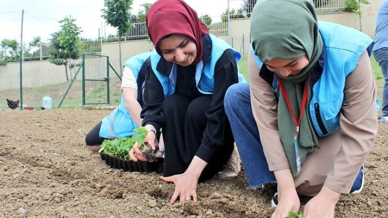 Düzce’de gençler yurdun bahçesinde oluşturdukları hobi bahçesine sebze fidanı dikti.