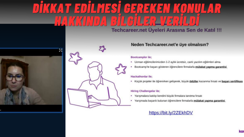 DÜZCE(DMHA) Moderatörlüğünü Öğr. Gör. Nurten Merdivenci’nin yaptığı etkinlikte kişinin kendini tanımasının önemini vurgulayarak sözlerine başlayan Tuba Karadağ İyiokur, öğrencilerin aktif bir eğitim hayatı yaşamalarını, öğrenci kulüplerine katılarak etkinlikler düzenlemeleri gerektiğinin altını çizdi. Eğitim hayatı süresince öğrencilerin kariyer hedefi paralelindeki; seminerlere, spor, kültür etkinliklerine, sertifikalı eğitimlere katılarak deneyim kazanmaları tavsiyesinde bulundu. Hedef belirlemenin kariyer gelişim sürecindeki önemini vurgulayan Tuba Karadağ İyiokur, kariyer gelişiminde; ulaşılmak istenilen noktanın belirlenmesi, bu yolda eksik yönlerin tamamlanması, aynı yolda giden kişilerin yol haritalarının öğrenilmesi ve gelecek için hazırlanılması gerektiğini söyledi. Staj yapmanın önemine de değinen Tuba Karadağ İyiokur, iş başvuruları için hazırlanan özgeçmişlerin; doğru, açık ve düzgün bir şekilde olmasının çok önemli olduğunu, kişilerin öz geçmişlerini öne çıkarmaları için; dolu ve güçlü yönlerini, özet bilgi alanını, detaylı iş deneyimini, yetenekler alanını, uygunluk puanını, özet bilgi alanını, başvuruya özel ön yazı gibi alanların mutlaka doldurulması gerektiğini ve özgeçmişin sık sık güncellenmesi gerektiğinin altını çizdi. Program soru-cevap bölümünden sonra sona erdi.
