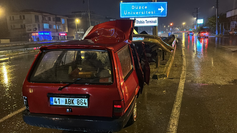 Düzce’de kontrolden çıkan otomobil bariyerlere saplanarak parçalandığı kazada 3 kişi yaralandı.
