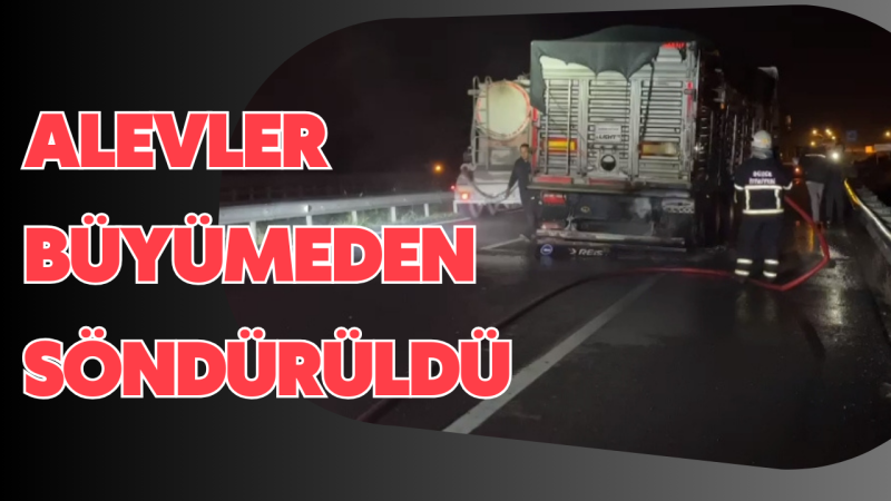 DMHA - Gece saatlerinde Kuzey Çevre Yolunda seyir halinde bulunan tuz yüklü tır bilinmeyen bir nedenden dolayı alt kısmından alev aldı. Tır sürücüsünün yangını fark etmesi sonucu yol kenarına durarak durumu Düzce Belediyesi İtfaiye Ekiplerine haber verdi. Kısa sürede olay yerine gelen itfaiye ekipleri alevlere müdahale etti. Ekiplerin uzun çabaları sonucunda yangın büyümeden kontrol altına alınırken soğutma çalışması yapıldı. Yangın nedeni ile trafik tek şeritten verilirken tırın kaldırılması sonucunda trafik normal seyrine döndü.
