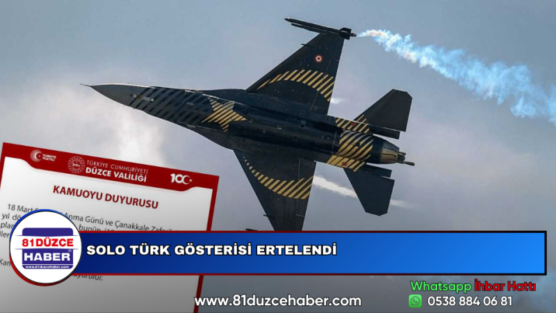 18 Mart Şehitleri Anma Günü ve Çanakkale Zaferi’nin 110. yıl dönümü dolayısıyla Düzce’de gerçekleşecek olan Solo Türk gösteri uçuşu ileri bir tarihe ertelendiği duyuruldu.