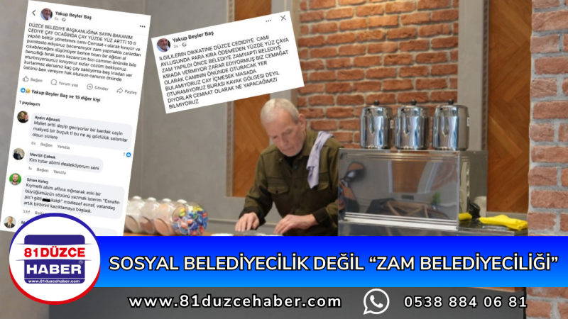 BEL-TUR’a bağlı sosyal mekanlarda çay fiyatlarına yapılan zamlar yüzde 100’e ulaştı. Örneğin, Cedidiye Camii kıraathanesinde çayın fiyatı 5 TL'den 10 TL'ye, Millet Bahçesi kıraathanesinde ise 10 TL’den 20 TL’ye çıkarıldı. Bu durum, başta Düzceli vatandaşlar olmak üzere, birçok kesimden sert eleştiriler aldı.