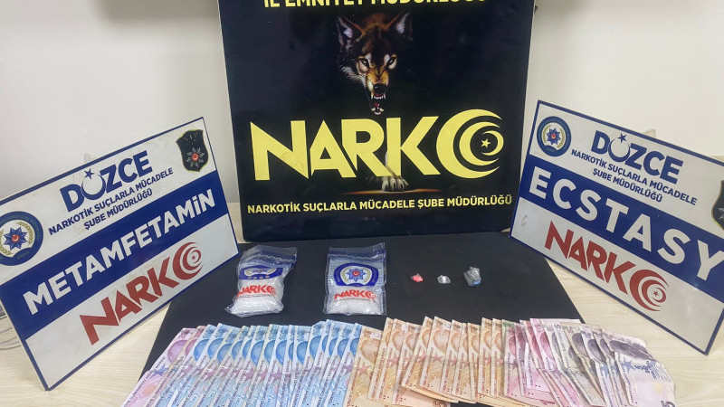 Düzce Cumhuriyet Başsavcılığınca uyuşturucu ticareti yapmak suçu dahilinde yürütülmekte olan soruşturmada Narkotik Suçlarla Mücadele Şube Müdürlüğü ekiplerince Terzialiler Mahallesi'nde durumundan şüphelenilip durdurulan Düzce plakalı araçta ve araçta bulunan C.M. ve G.D. isimli şahısların yapılan üst aramasında; 2 parça halinde toplam 144 gram metamfetamin, 2 adet ecstasy hap, 1 adet sentetik ecza ve suçtan elde edildiği değerlendirilen 2 bin 550 TL ele geçirildi.