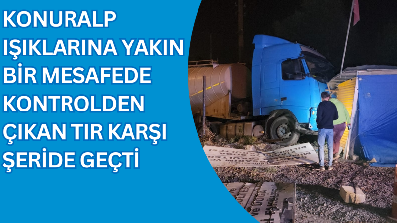 Kaza gece saatlerinde Düzce- Akçakoca D-655 Karayolunda meydana geldi. Edinilen bilgiye göre Birol K. idaresindeki tır Konuralp ışıklarına yakın bir mesafede kontrolden çıktı. Işıklarda bekleyen Nail K. idaresindeki 81 AJ 156 plakalı araca çapmamak için tır sürücüsün son anda direksiyonu kırması ile karşı şeride geçerek yol kenarında bulunan barakalara çarparak durabildi. Kazada yaralanan olmazken büyük bir felaket kıl payı atlatıldı. Polis ekipleri kaza ile ilgili inceleme başlattı.