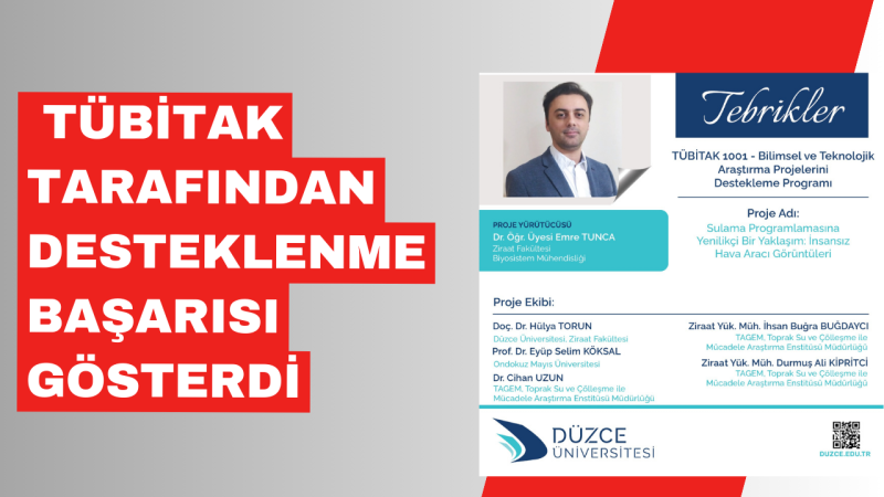 Düzce Üniversitesi Ziraat Fakültesi Biyosistem Mühendisliği Bölümü’nden Dr. Öğr. Üyesi Emre Tunca’nın yürütücülüğünü gerçekleştirdiği proje ile TÜBİTAK tarafından desteklenme başarısı gösterdi.