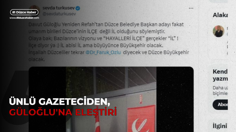 DMHA -DÜZCE- Bir dönem Yeni Şafak gazetesinde köşe yazarlığı yapan, yazdığı kitaplar ve katıldığı televizyon programlarıyla tanınan Sevda Türküsev, sosyal medya hesaplarından yaptığı paylaşımla Düzce Belediye Başkan Adayı Davut Güloğlu’nu eleştirdi. Türküsev, Davut Güloğlu’nun Düzce’ye İl demesi gereken yerde İlçe dediği anların görüntüsünü paylaşarak ‘Davut Güloğlu Yeniden Refah’tan Düzce Belediye Başkan adayı fakat umarım birileri Düzce’inin İLÇE değil İL olduğunu söylemiştir. Olaya bak; Bazılarının vizyonu ve “HAYALLERİ İLÇE” gerçekler “İL” ! İlçe diyor ya :) İL abisi İL ama büyüyünce Büyükşehir olacak.’ İfadelerini kullandı. Yaptığı paylaşımı saatler içinde silen Gazeteci Türküsev, Düzceli vatandaşlar tarafından tepki gördü.