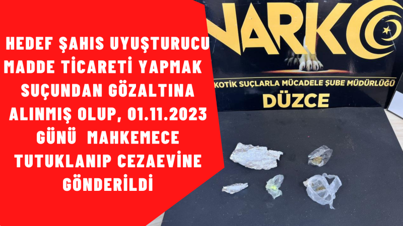 Cumhuriyet Başsavcılığı ve Narkotik Suçlarla Mücadele Şube Müdürlüğünce yürütülen planlı-projeli çalışmada; Düzce’de Uyuşturucu madde sattığı tespit edilen C. D. (1985 Düzce, 12 adet suç kaydı mevcut) isimli hedef şahıs 31.10.2023 günü yakalandı.