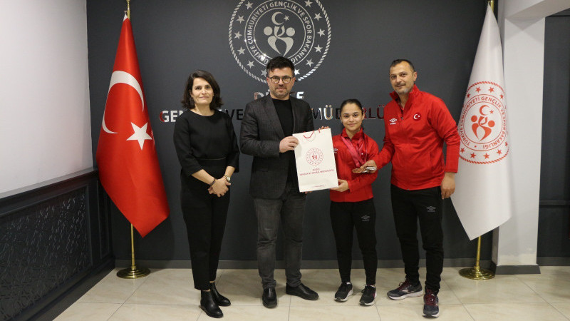 Arnavutluk’ta düzenlenen Yıldızlar Halter Dünya Şampiyonasında ikinci olan Düzceli sporcusu Yağmur Melek Şahin, Gençlik ve Spor Müdürü İsa Yazıcı’yı ziyaret etti.