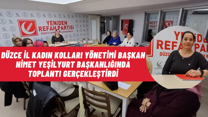 Türkiye’nin önemli siyasal hareketlerinden olan Milli Görüş Hareketi ve Refah Partisi’nin devamı olan Yeniden Refah Partisi Genel Başkan Fatih Erbakan ve il teşkilatları ile birlikte yerel seçim çalışmalarına hızlı başladı. Bu çerçevede parti binasında bir araya gelen Yeniden Refah Partisi Düzce İl Kadın Kolları yönetimi Başkan Nimet Yeşilyurt başkanlığında toplantısını gerçekleştirdi. Yapılan toplantıda yerel seçim stratejileri masaya yatırılırken 21-24 Kasım 2023 tarihinde Düzce’ye gelecek olan Yeniden Refah Partisi Kurucuklar Kurulu ve MKYK üyesi, Milli Görüş Lideri Rahmetli Prof. Dr. Necmettin Erbakan’ın Kızı Elif Erbakan Altınöz ile Genel Merkez Kadın Kolları üyelerinin Düzce programını belirlediler.