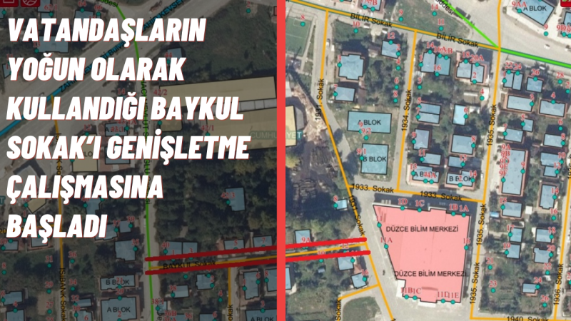 Cumhuriyet Mahallesi’nde ana cadde olan Sivrioğlu Sokak ile Düzce Belediyesi Çocuk Üniversitesi ile Bilim Merkezi’nin arasındaki bağlantıyı sağlayan ve vatandaşların yoğun olarak kullandığı Baykul Sokak’ı genişletme çalışmasına başladı.