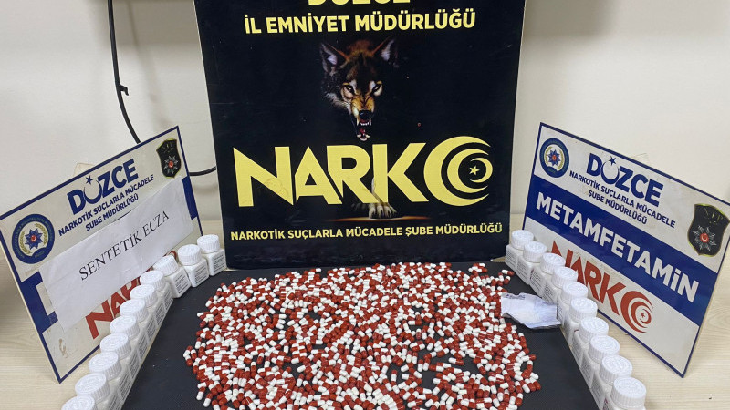 Düzce İl.Emniyet Müdürülüğü Asayiş şube Müdürlüğü'ne bağlı ekiplerin Kültür mahallesinde yaptıkları denetimler sonucunda şüphelendikleri 81ACS 854 plakalı aracı durudurdu. Araçta bulunan M.T. ve Ö.İ. isimli şahıslar üzerinde yaptıkları aramalar neticesinde şahısların üzerinden 840 adet sentetik hap ve 3 gram Metanfetamin olarak adlandırılan uyuşturucu madde ele geçirildi. Göz altına alınan iki kişi Narkotik Suçlarla Mücadele Müdürlüğü ekiplerine teslim edildi. Yakalanan iki kişi haklarında Uyuşturucu Madde Ticareti Yapmak suçundan çıkarıldıkları mahkemece tutuklandı.