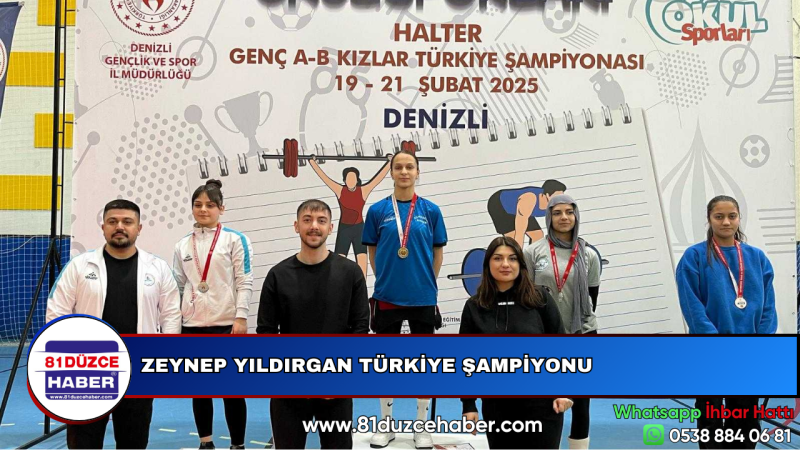 DMHA DÜZCE - Gençlik ve Spor Bakanlığı ile Milli Eğitim Bakanlığı arasında imzalanan protokol gereği 2024-2025 Eğitim Öğretim Yılı Okul Spor yarışmaları kapsamında Okul Sporları Genç A-B Kızlar Halter Türkiye Şampiyonası Denizli’de yapıldı. 19-21 Şubat 2025 tarihleri arasında Denizli’de düzenlenen Okul Sporları Genç A-B Kızlar Halter Türkiye Şampiyonası’nda antrenör Bünyamin Durmaz eşliğinde 49 kg da yarışan Düzceli sporcu Zeynep Yıldırgan, Türkiye şampiyonu oldu.